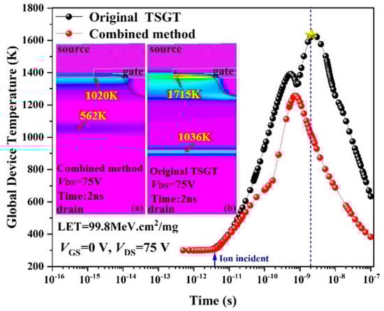 Trend of the lattice temperature of the 120 V-rated TSGT MOSFET and hardened structure by the combined method after heavy-ion incidence. Maximum temperature distributions of the (a) hardened structure by combined method and (b) the original TSGT for 2 ns after a heavy-ion strike at VDS = 75 V.