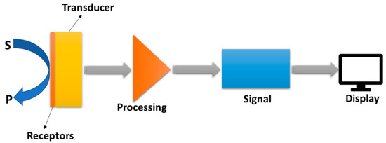 According to the IUPAC (International Union of Pure and Applied Chemistry), a chemical sensor is defined as “a device that converts chemical data, ranging from the concentration of a single sample component to complete composition analysis, into an analytically usable signal” [7]. This device typically comprises two main functional components: a receptor and a physicochemical transducer (Figure 1). The receptor, through highly specific interactions with the analyte, converts chemical information about a sample into a form of energy, while the transducer then transforms this energy into the form of an analytical signal with a measurable value [8]. Chemical sensors, based on the operating principle of the transducer, can be classified as (1) optical, converting changes in optical phenomena (i.e., absorbance, reflectance, luminescence, and fluorescence) resulting from the receptor–analyte interaction; (2) electrochemical, converting electrochemical interaction between the analyte and the electrode; (3) mass, transforming the changes in mass caused by the accumulation of the analyte on the receptor surface; (4) thermal, based on the heat effects associated with a particular chemical reaction or adsorption involving the analyte; (5) and magnetic, based on the alteration of the paramagnetic properties of the analyte [7].