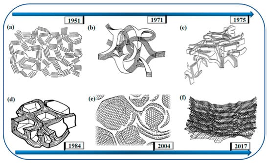 Schemes presenting structural models of glassy carbon proposed over years by (a) Franklin; (b) Jenkins and Kawamura; (c) Ban; (d) Shiraishi; (e) Harris; (f) Jurkiewicz [18]. Reprinted from ref. [18], with permission from Elsevier.