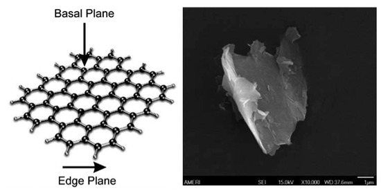 A conceptual schematic model of the structure of graphene, indicating its basal and edge plane-like sites, and an SEM image of a single atomic layer of graphite, known as graphene. Note that in reality, the graphene utilized in the majority of work is 1–4+ layers thick. Reprinted from ref. [48], with permission from Royal Society of Chemistry.