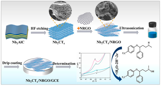 One of the most popular graphene materials used as a component of electrode modification layer is reduced graphene oxide, mostly due to the simplicity of the preparation of a modifier solution. For example, nanocomposites of RGO and metal nanoparticles or metal oxides were currently used in voltametric analysis. A combination of RGO and Co3O4 was applied towards highly sensitive serotonin determination in pharmaceuticals and blood serum samples. The usage of this kind of modification results in achieving a detection limit of 48.7 nM and a high sensitivity of 2.2 mA mM−1 cm−2 [57]. Demonstrated sensor exhibits very good recovery values for the determination of serotonin directly from human blood serum samples, without any sample preparation pretreatments. In the next paper, a combination of RGO with nickel–cobalt oxide microspheres was prepared and placed on the pencil graphite electrode for venlafaxine determination in the pharmaceuticals and human plasma. The obtained detection limit was measured as 3.4 nmol L−1, and recovery values for venlafaxine determination in the real samples ranged from 96.0 to 100.7%. The use of this type of modification allowed the elimination of the influence of interference on the signal from the analyte [58]. Another type of proposed RGO usage was to mix it with palladium nanoparticles to develop a sensor sensitive to desipramine. Its determination was based on the process of electrochemical oxidation on the surface of the glassy carbon electrode modified with an RGO/PdNP suspension. The authors proved that the usage of this prepared electrode allows the determination of the antidepressant with a limit detection of 1.04 nmol L−1, and the sensor was successfully applied for determination in urine samples [59]. The process for quantifying the antidepressant is based on the reversible electrode oxidation of the electrochemically generated desipramine dimer. This feature is particularly noteworthy due to the higher anodic peak current observed in this electrochemical process compared to other peak currents in the desipramine voltammetric profile, potentially enhancing the sensitivity of the analytical method. For another type of RGO nanocomposite (with gold nanoparticles), laser-assisted ablation was necessary to create a new type of modification suspension. This fabricated LI-AuNP-rGO/GC electrode was used for alprazolam determination with a wide linearity range and a detection limit of 0.3 µg L−1. The authors used the proposed sensor for alprazolam determination in spiked beverage samples with good reproducibility and repeatability of the measurements [60]. The analytical performance demonstrated the potential of the proposed sensor as an alternative method, or even a screening tool, for detecting suspected alprazolam spiking at crime scenes. Not only metal oxides or nanoparticles can be incorporated in the composite layers consisting of RGO for voltametric measurements. Molecules such as phosphotungstic acid can be a part of modification layers, for example, in highly sensitive paroxetine determination. It was proven that this mixture placed on the pencil graphite electrode facilitates the determination of paroxetine, enabling a detection limit of 9.0 × 10−10 M. The authors used this electrode for real sample measurements (tablets, human serum, and urine), achieving recovery parameters in the range of 97.6–101.6% [61]. Reduced graphene oxide can also be a component of carbon paste electrodes mixed with β-Ni(OH)2 and ionic liquid. The combination of these modifiers leads to excellent electrocatalytic activity and voltammetric performance for sulpiride sensing. The sensitivity for determination was over twice as high as that of the unmodified CPE. The sensor demonstrated by Mohamed et al. was characterized by the authors with high reproducibility, selectivity, and sensitivity, along with advantages such as time efficiency, simplicity, and cost-effectiveness. Furthermore, the proposed electrochemical sensor was successfully applied for the quantitative detection of the analyte in tablets, urine, and plasma [62]. In another work, the AuNPs@GRP nanocomposite was synthesized in a single step using GO and gold salt and placed on the surface of the glassy carbon electrode. This prepared sensor was successfully used for vortioxetine determination in concentrations as low as 50.0 nM. The key advantages of the AuNPs@GRP/GCE, according to the authors, include high sensitivity, selectivity, reproducibility, a broad linear range, and a low detection limit. Considering these parameters, the proposed sensor demonstrates exceptional analytical performance for the determination of vortioxetine [63]. In the next study, a composite electrochemical sensor was developed for the detection of fluoxetine by etching and synthesizing niobium carbide (Nb2CTx) material, which was then ultrasonically combined with nitrogen-doped reduced graphene oxide (NRGO) (Figure 5). The synergistic Nb2CTx/NRGO/GCE exhibited superior electrochemical performance, including enhanced electroactive area, improved electron conduction, and better electrocatalytic ability compared to the bare GC electrode, making it suitable for fluoxetine (FLX) detection with a detection limit of 0.34 µM. This sensor offers a wider linear range and a lower detection limit compared to other electrochemical sensors for FLX detection, making it highly practical. Furthermore, the sensor demonstrated good reproducibility, repeatability, and stability [64].
