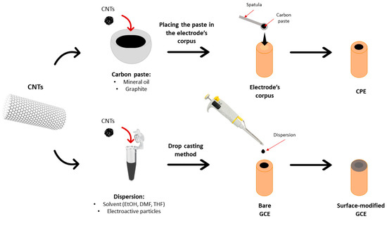 Different electrode modification techniques were developed in order to obtain CNT-based sensors designed for antidepressant analysis. Typically, CNTs are utilized in the bulk modification of carbon paste electrodes (CPEs) and surface modification of solid-state electrodes (mainly GCEs). In the first approach, carbon paste has been used as a matrix for incorporating carbon nanotubes and other modifiers to improve the electrocatalytic properties of voltammetric sensors [93]. The surface modification has been mainly realized by drop casting a solution of CNTs to form a carbon nanotube film at the electrode surface (Figure 7). Recent studies have shown that CNT-modified electrodes can enhance the sensitivity of antidepressant determination, thereby improving the limit of detection in voltammetric measurements.