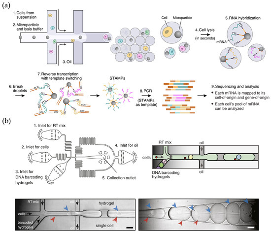 (a) Schematic diagram of the workflow of the Drop-seq technique. Reproduced with permission from Ref. [23]. Single cells are encapsulated in tiny droplets along with uniquely barcoded primer beads, enabling large-scale, highly parallel analysis. (b) Microfluidic device used in inDrop technology. Reproduced with permission from Ref. [20]. Cells are captured and barcoded in nanoliter droplets with high capture efficiency. Arrows indicate cells (red), hydrogels (blue), and flow direction (black).