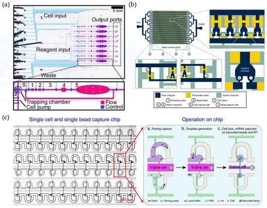 In 2014, Streets et al. proposed a semiautomated single-cell high-throughput sequencing program with a high sensitivity and precision [22] (Figure 3a). Individual cells from the cell suspension were sequentially directed by a peristaltic pump into each of the eight trapping chambers and pressurized into the sorting chamber, while multiple cells were discarded through the isolation valve. After sorting, the reagents were filled through the reagent input line and then the reactant was diffused and mixed by controlling the on–off state of the valve above the two chambers. Notably, the integration of valves and pumps had a significant advantage over well-based methods in terms of raw sample contamination removal, which makes it extremely suitable for scarce or easily contaminated samples, such as circulating tumor cells (CTCs). In 2019, Cheng et al. engineered Hydro-Seq chips that could process 10 ml of patient blood containing CTCs [43] (Figure 3b). The customized channel size and valve design captured individual CTCs from the sample into each chamber, while contaminants such as erythrocytes and leukocytes could be transferred. The difference in shape between the bead and capture ports facilitated bead loading. In addition, the valves were closed to the separated chambers, thus allowing for cell lysis and mRNA capture in the separated chambers.