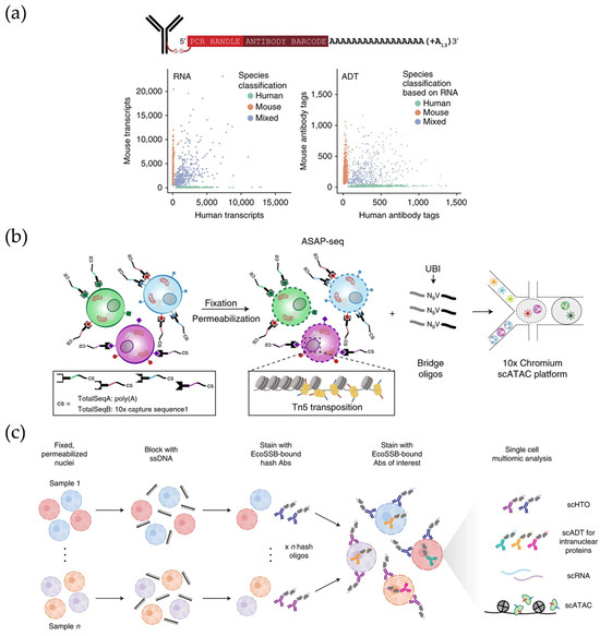 - Chen, A.F.; Parks, B.; Kathiria, A.S.; Ober-Reynolds, B.; Goronzy, J.J.; Greenleaf, W.J. NEAT-Seq: Simultaneous Profiling of Intra-Nuclear Proteins, Chromatin Accessibility and Gene Expression in Single Cells. Nat. Methods 2022, 19, 547–553. [Google Scholar] [CrossRef]