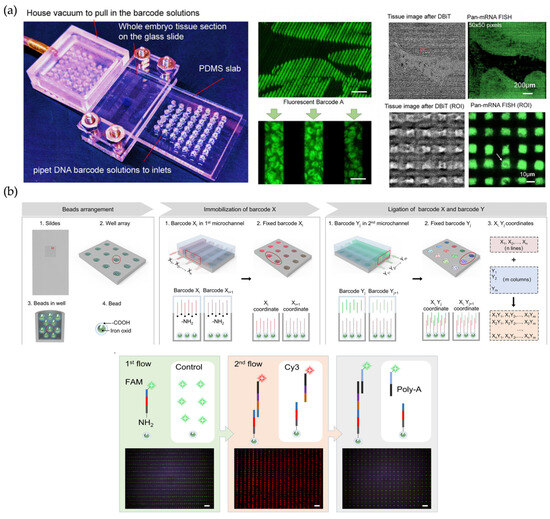 Microchannel-based SRT methods offer an unprecedented perspective on the analysis of biological regulatory networks due to their flexibly adjustable spatially barcoded pixels and their ability to integrate various omics layers. Distinguishing from the solid-phase matrix capture of biomolecules described above, DBiT-seq delivered barcodes for the direct localization of nucleic acids or proteins onto tissue sections [91] (Figure 6a). The key to the method was the sequential use of two PDMS microfluidic chips lined with 50 parallel microchannels. Since the microchannels between the two chips were oriented vertically, the intersecting pixels formed a spatial grid. The resolution of the above pixels could reach up to 10 μm and capture about 2000 genes by adjusting the distance between the microchannels. DBiT-seq is capable of analyzing the proteome, transcriptome, and transcriptome of the same tissue section while maintaining a high resolution [91]. It is also compatible with optical image characterization, which makes the chip capable of an all-round accurate analysis of multi-omics data based on morphological structure. In addition to FF sections, this strategy is also compatible with FFPE tissues with an accuracy of a 50 μm point spacing [92]. Furthermore, microchannel-based PDMS chips can also be used to modify paramagnetic particles, thus avoiding the channel blockage problems associated with tissue deformation while retaining the advantage of flexible resolution adjustment [25] (Figure 6b).
