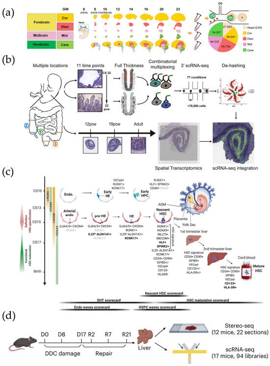 (a) Location, period, study design, and number of cells sequenced information. Reproduced with permission from Ref. [100]. (b) Overview of study design for intestinal development atlas. Reproduced with permission from Ref. [105]. (c) A schematic displaying the key cell types, stages, and markers involved in human hematopoietic stem and progenitor cell (HSPC) specification, emergence, and maturation. Reproduced with permission from Ref. [84]. (d) Schematic of DDC-induced injury and repair. Reproduced with permission from Ref. [109]. Spatiotemporal analyses of cholestatic injury and repair processes in mice reveal the potential of the spatiotemporal transcriptome for tissue injury and regeneration studies.