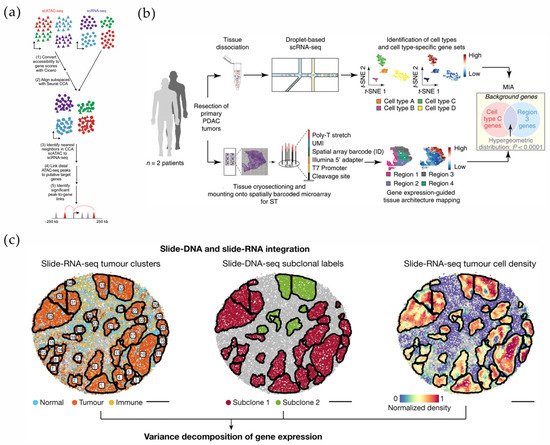 Currently, scRNA-seq and ST, either alone or in combination, have been developed as powerful tools for interpreting pathological phenomena and evaluating disease-specific markers in complex or highly heterogeneous tissues. In the process of disease diagnosis and targeted therapies, the information obtained through this emerging technology platform covers the scope and dimensions from cell-to-cell interactions to intracellular transcriptional mechanisms, from holistic networks to dynamic microenvironments, and from tissue heterogeneity to single-cell heterogeneity [16,61,125,130,131]. Multimodal intersection analysis (MIA) enables the integration of scRNA-seq and ST datasets from the same lesion region and the subsequent spatial assessment of the cell types enriched in the region or cluster by the degree of overlap of specifically expressed genes between the two. As an early mode of dataset integration, MIA provides spatial cell specificity, as well as an immune repertoire of lesion regions such as pancreatic ductal adenocarcinoma (PDAC) [129], esophageal squamous cell carcinoma [132], and cervical squamous carcinoma [133] (Figure 8b).
