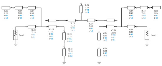 Typically, each set of microstrip lines corresponds to a resonant unit. Resonators are key components in RF circuits, widely used in filters, oscillators, and other RF devices. The basic principle relies on the self-resonance characteristic of the circuit, generating resonance within a specific frequency range. Common resonator structures include microstrip resonators, cavity resonators, and dielectric resonators. A microstrip resonator is generally composed of a microstrip line and a ground layer, with the resonant frequency controlled by adjusting the microstrip line’s geometric dimensions. The length of the microstrip line determines the resonant frequency, and variations in length directly affect the frequency’s increase or decrease. Additionally, the microstrip resonator can achieve high selectivity and low insertion loss through its structural design, enabling effective signal selection and filtering across multiple frequency bands. Therefore, a rational resonator structure design is crucial to the performance of the filter [8,9].