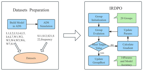This paper uses the improved RF device parameter extraction optimization algorithm (IRDPO) proposed in Section 2.4 to optimize the design parameters of the Ka-band filter. The process is shown in Figure 3 and consists of two main parts: the generation of the simulation dataset and the optimization search using the IRDPO algorithm.