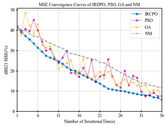 In each experiment, the minimum error value in each iteration for a given initial parameter set was considered the optimal solution for that set, and the results were recorded accordingly. After multiple trials, the average value of the optimal solutions was computed, and an error convergence curve was plotted to objectively evaluate the optimization performance of each algorithm. The MSE convergence trend of the insertion loss for the filter is illustrated in Figure 4.