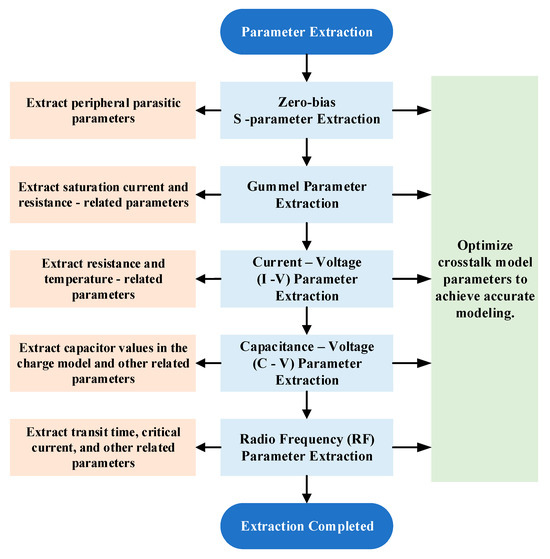 In this experiment, the size of the multi-cell HBT device used is 3 μm × 40 μm × 2–6 (emitter width × emitter length × emitter exponent-cell number), and the main operating frequency band is 0.7 to 25.1 GHz. The modeling process is shown in Figure 1. Compared with a single-cell HBT device, the structure of a multi-cell HBT device is more complex and compact, introducing additional parasitic effects, and exhibiting more pronounced coupling and thermal effects during device operation. Therefore, when modeling a multi-cell device, it is not possible to simply parallel the model of a single-cell device. Instead, based on the single-cell device model, comprehensive parameter extraction and optimization should be carried out by combining actual structure and measurement data [16].