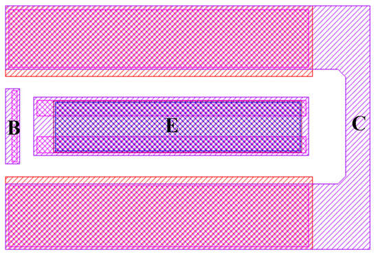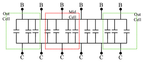 Since the base interconnects of each cell are identical, the values of LBinm(n=1–6; m=1–2) and RBinm(n=1–6; m=1–2) are the same. As can be observed from the layout structure in Figure 3, the multi-cell device is not simply a parallel connection of single-cell devices; the collector structures of the cells are shared. In this case, the component values representing the high-frequency distributed effects of the collectors cannot be simply averaged. The values of LCinm(n=1–7; m=1–2) and RCinm(n=1–7; m=1–2) are divided into two categories: the equivalent component values of the two collector interconnects located at the periphery of the multi-cell device are defined as Lout and Rout, while the equivalent component values of the five internal collector interconnects are defined as Lmid and Rmid. From Figure 4, it can be seen that the four internal cells share collectors with adjacent cells. Assuming that the collector currents of each cell are equal, the equivalent cross-sectional area of the shared collector interconnects is half that of the non-shared interconnects. This leads to the derivation of Formulas (19) and (20).