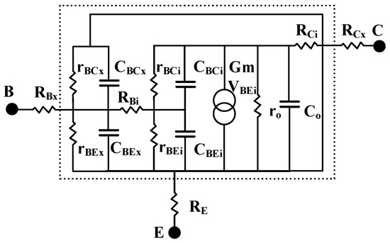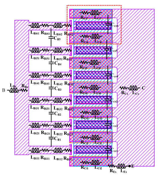 Figure 4 illustrates the layout structure of a multi-cell HBT device, with the dashed box indicating the single-cell section. An analysis of the layout structure indicates that, compared to single-cell devices, multi-cell devices introduce additional parasitic elements, including the following: the parasitics of the lumped base, emitter, and collector metal leads; the coupling capacitance between the lumped emitter metal leads and the collectors of each cell; the coupling capacitance between the base leads of each cell; and the additional parasitics generated by the high-frequency distribution effects among the leads of each cell under high-frequency conditions [17,18,19]. Based on the aforementioned analysis, the equivalent circuit of the multi-cell HBT device as illustrated in Figure 5 has been established. The parasitic effects of the lumped base, collector, and emitter leads are represented by LBx, RBx, LEx, REx, LCx, and RCx. The coupling capacitance between the base leads is characterized by capacitors CBi(i=1–5), while the coupling capacitance between the lumped emitter and the collectors of each cell is denoted by capacitors Ccei(i=1–6). The high-frequency distribution effects of the base leads of each cell are represented by LBinm(n=1–6; m=1–2) and RBinm(n=1–6; m=1–2), and those of the collector leads of each cell are represented by LCinm(n=1–7; m=1–2) and RCinm(n=1–7; m=1–2). The locations of these parasitic elements are annotated in the layout structure.