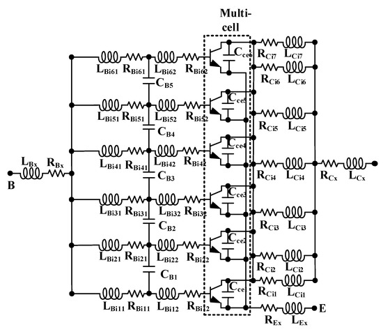 In order to simplify the parameter extraction process, the equivalent circuit in Figure 5 is simplified to the style in Figure 6. RBSkin, LBSkin, RCSkin, and LCSkin are used to characterize the high-frequency distribution effect. The multi-cell represents the part within the dotted line in Figure 5.