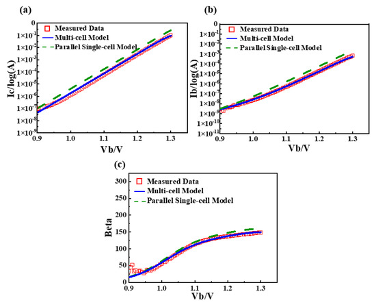 Gummel plot fitting results and model comparison. (a) Ib-Vb curve; (b) Ic-Vb curve; (c) Beta-Vb curve.