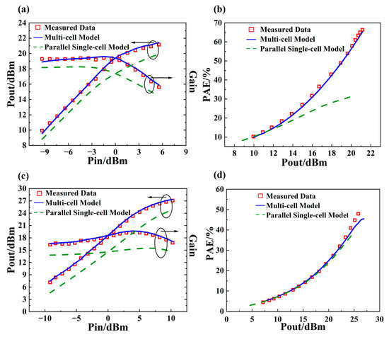 Fitting results and model comparison. (a) Pout/Gain-Pin curve at 2.6 GHz; (b) PAE-Pout curve at 2.6 GHz; (c) Pout/Gain-Pin curve at 3.5 GHz; (d) PAE-Pout curve at 3.5 GHz.