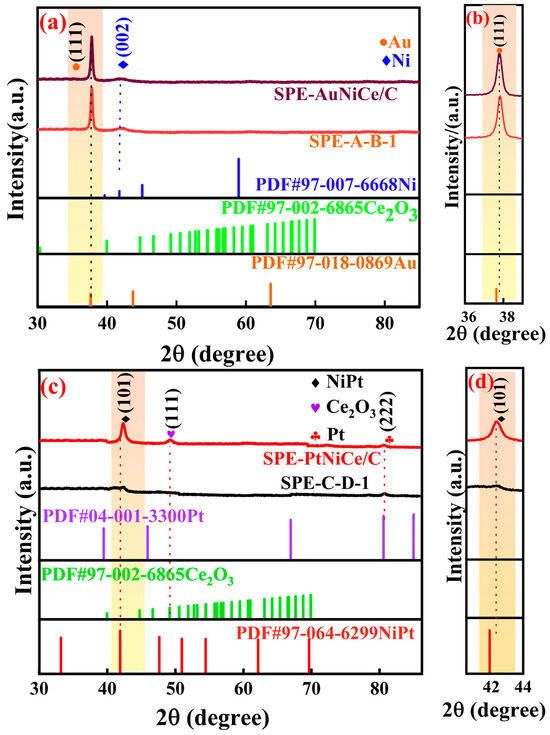 (a) XRD patterns of samples SPE-AuNiCe/C and SPE-A-B-1; (b) magnified view of the (111) crystal plane of the corresponding samples SPE-AuNiCe/C and SPE-A-B-1; (c) XRD patterns of samples SPE-PtNiCe/C and SPE-C-D-1; (d) magnified view of the (101) crystal plane of the corresponding samples.