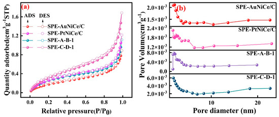 BET analysis of SPE-AuNiCe/C, SPE-A-B-1, SPE-PtNiCe/C, and SPE-C-D-1 samples. (a) N2 adsorption/desorption isotherms; (b) pore size and pore volume curves.
