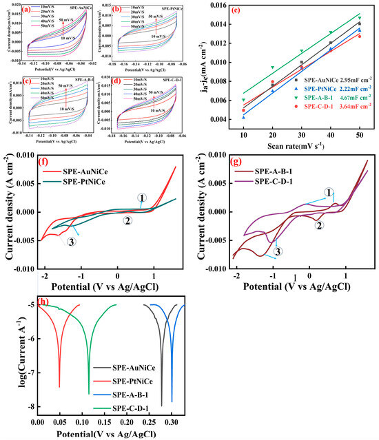 Electrochemical performance of SPE-AuNiCe/C, SPE-PtNiCe/C, SPE-A-B-1, and SPE-C-D-1 samples. (a–d) CV curves at different scan rates; (e) Cdl; (f) CV curves; (g) CV curves; (h) Tafel curves.