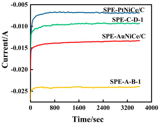 I–t curves for cyclohexene hydrogenation of SPE-AuNiCe/C, SPE-PtNiCe/C, SPE-A-B-1, and SPE-C-D-1 samples.