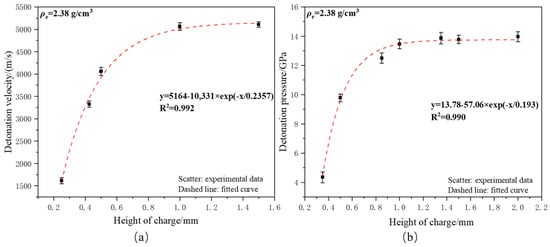 (a) The influence of charge height on the detonation velocity of copper-based azide; (b) the influence of charge height on the detonation pressure of copper-based azide.