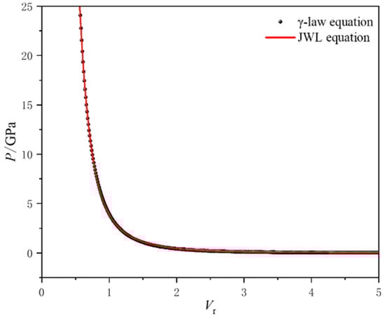 The comparison of the P-V relationship curves output by the γ-law equation and the JWL equation.