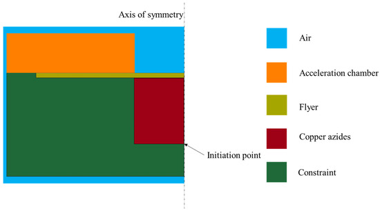 The simulation model for the copper-based azide micro-charge, as shown in Figure 3, is established. Given that the device has a symmetric structure, a half-model (1/2) is adopted to simplify the simulation and improve computational efficiency. The model is constructed using actual dimensions and the μs-cm-g unit system. The grid size is set to 0.0001 mm × 0.0001 mm, with a time step of 0.001 μs and a total simulation duration of 1.5 μs. The copper-based azide is initiated by a point detonation, with the initiation point located at the center of the bottom of the charge column. The simulation model is shown in Figure 3.