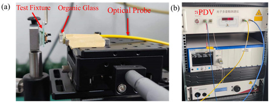 To validate the accuracy of the simulation model and material parameters, a Photonic Doppler Velocimeter (PDV) is used to capture the velocity–time curve of the flyer driven by micro-charge detonation. The flyer velocity measurement system includes a firing circuit, test fixture, optical probe, PDV, and oscilloscope. A schematic diagram of the system and its experimental setup are presented in Figure 4.
