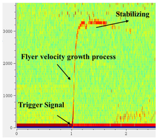 To protect the PDV optical probe, an organic glass (PMMA) window is placed at the probe’s location. The raw data recorded by the oscilloscope is processed using PDVlab software (Version 1.3) to derive the velocity–time spectrum of the flyer. A typical flyer velocity–time curve is presented in Figure 5. In the figure, the intensity of the red area correlates with the strength of the signal at that point. By extracting the data points from the image, the flyer velocity curve is obtained, with a data error of ±50 m/s.