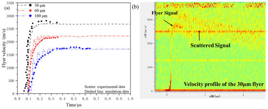 As shown in Figure 6b, the experimental curve for the 30 μm flyer differs from the typical curves of the 60 μm and 100 μm flyers. The PDV signal for the 30 μm flyer is weaker, and after reaching a steady velocity, it shows a large area of scattered signals. This could be due to significant surface deformation and changes in the laser incidence angle during the motion of the thin flyer, which degrade the PDV interference signal quality. Since the laser spot diameter from the PDV optical fiber is approximately 0.8 mm, the PDV measures the cumulative velocity signals from most of the flyer’s surface. The scattered signal indicates a significant velocity deviation at different positions of the flyer, suggesting that the flyer may have fragmented.