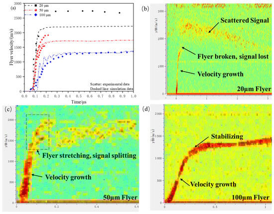 Compared to the typical motion curve of a 100 μm flyer, the 20 μm flyer experiences a rapid velocity increase followed by signal loss, and then the velocity increases noticeably with the appearance of scattered signals, indicating that the flyer undergoes fragmentation. As shown in Figure 7c, as the motion distance increases, the velocity curve for the 50 μm flyer gradually splits into two, which is due to the PDV simultaneously capturing velocity signals from both the center and the edge of the flyer. This indicates that the edge stretching effect causes an increasing velocity gradient in the flyer.