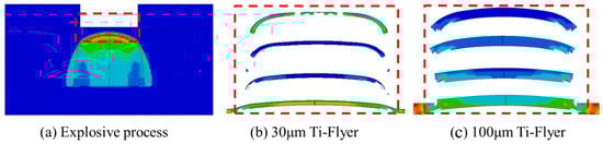 The shear-driving process of the flyer was analyzed using the results from the simulation model. The simulation results, shown in Figure 8, highlight the red and blue areas, representing high-strain and low-strain regions, respectively. A point detonation model was used to simulate the bridge film’s detonation, causing the detonation wave to propagate as a spherical wave through the copper-based azide material. Driven by the spherical detonation wave, the velocity at the flyer’s center is higher than at its edges. The shear force from the acceleration chamber causes the flyer’s edges to bend backward, while its center stretches and thins, forming an overall curved shape. Thin flyers, due to their lower mass and higher driving acceleration, exhibit a more pronounced velocity gradient. The edge-stretching effect causes fractures at the center of the thin flyer. Therefore, increasing the flyer’s thickness can enhance its integrity and flatness.