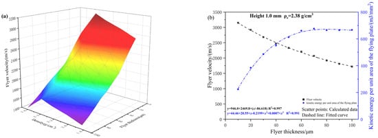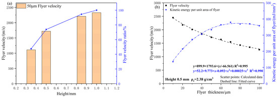 (a) The relationship between density, flyer thickness and velocity; (b) The relationship between flyer thickness, velocity and unit area kinetic energy.