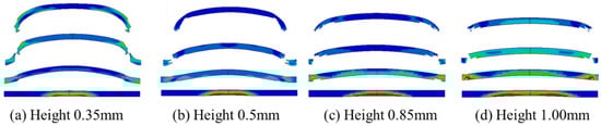 Since the detonation wave propagates spherically within the micro-sized charge, the charge height affects the peak pressure of the shockwave and the incident area, which, in turn, influences the final velocity and morphology of the flyer. Keeping all other parameters constant, with a 50 μm thick flyer as an example, the charge height in the simulation model was varied to analyze the corresponding shear-driving process of the flyer. The simulation results are presented in Figure 10. From the figure, it can be seen that as the charge height decreases, the area affected by the spherical detonation wave decreases, and the curvature of the flyer increases after shear formation. Thicker flyers are more likely to form a rod-shaped morphology, while thinner flyers are more prone to fragmentation.