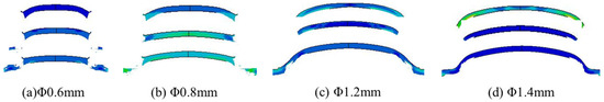 Assuming consistent diameters for the multi-layer acceleration chambers and using a copper-based azide charge with dimensions of Φ1.0 mm × 0.5 mm and a 50 μm titanium flyer as the research subjects, a simulation model was employed to study the effects of acceleration chamber diameter and length on flyer morphology and final velocity. The influence of the acceleration chamber diameter on flyer morphology is shown in Figure 12, and the simulation results for flyer velocity are shown in Figure 13.