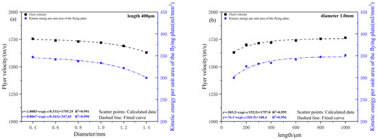 When the length of the acceleration chamber is fixed, the flyer’s velocity and specific kinetic energy decrease as the chamber diameter increases. This is because the chamber diameter determines the area and mass of the flyer after shear, and a lower mass is more favorable for increasing the flyer’s velocity. Driven by the spherical detonation wave, when the acceleration chamber diameter is smaller than the charge diameter (1 mm), the shear morphology of the flyer is smoother. However, when the acceleration chamber diameter exceeds the charge diameter, velocity decay becomes more pronounced. In this case, detonation products primarily act on the central region of the flyer, accelerating it while dragging the edges, which intensifies the flyer’s deformation and reduces its overall velocity. In practical applications, the relationship between the acceleration chamber diameter and charge thickness can be used to appropriately reduce the chamber diameter, ensuring the flyer’s integrity. The chamber diameter should not exceed the charge diameter, nor should it be smaller than the critical diameter for initiating the lower-level charge for the flyer.