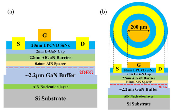 - Zhu, L.; Zhou, Q.; Chen, K.; Gao, W.; Cai, Y.; Cheng, K.; Li, Z.; Zhang, B. The Modulation Effect of LPCVD-SixNy Stoichiometry on 2-DEG Characteristic of UTB AlGaN/GaN Heterostructure. IEEE Trans. Electron Devices 2022, 69, 4828–4834. [Google Scholar] [CrossRef]