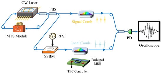 The structure of the coherent dual-microcomb interferometry system is shown in Figure 1. A single-frequency laser, stabilized to the rubidium atomic transition line [27], is used to drive two silicon nitride microresonators, ensuring their coherence. The seed light is split into two paths: one path is directly coupled into a microresonator to generate an SMC, while the other path is first modulated by an optical modulator for radio-frequency modulation, and then coupled into another microresonator to generate a second SMC. Each silicon nitride microresonator is integrated with a packaged TEC for thermal control, which adjusts the detuning between the resonance frequency and the pump laser frequency to enable the generation of SMCs. This system structure offers several advantages: first, the two SMCs share the phase of the seed laser, ensuring their coherence; second, thermal control of the resonance frequency enables independent control of the two microcombs without altering the pump laser frequency, which would otherwise affect the generation of both comb signals simultaneously.