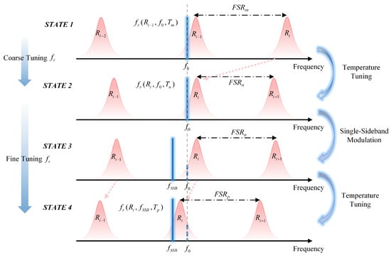 To achieve continuous tuning of the repetition rate while maintaining the stability of the other microcomb in the dual-comb system, the seed laser frequency is not directly altered. Instead, single-sideband modulation is applied using a continuously adjustable radio-frequency (RF) signal source to electro-optically modulate the seed laser and change the pump laser frequency , as illustrated in STATE 3 of Figure 2. However, under this condition, the detuning relationship between the resonance and the pump laser does not satisfy the criteria for soliton comb generation. Therefore, the TEC is used to slightly adjust the resonance frequency, shifting the microcavity resonance into the blue-detuned region of the pump laser frequency . The corresponding temperature is denoted as , and the FSR of the microcavity is represented as . The comb signal coupled out under these conditions has a repetition rate expressed as , referred to as STATE 4 in Figure 2.