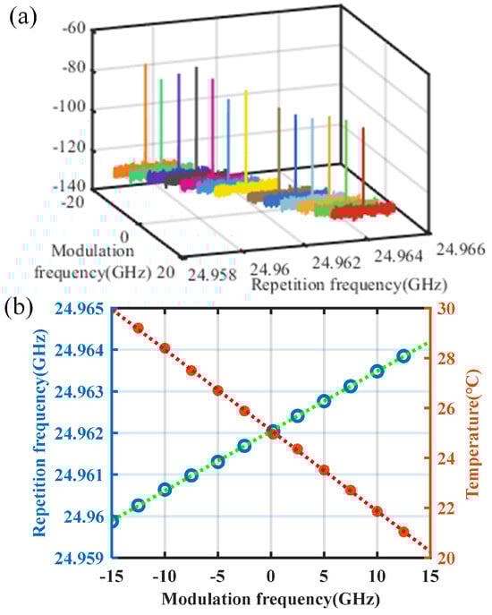 (a) Variations in the microcomb repetition rate corresponding to different single sideband modulation frequencies of the pump laser. (b) Linear fitting results illustrating the relationship between the pump laser modulation frequency, repetition rate, and temperature.