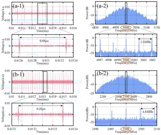 Dual-microcomb interferograms and their fourier transform results. (a) The local comb in 5 GHz, 23.52), exhibiting a repetition rate difference of 1.5 MHz relative to the signal comb. (b) The local comb in , 2.5 GHz, 15.97), exhibiting a repetition rate difference of 4.6 MHz relative to the signal comb. (a-1) The temporal interferogram corresponding to a repetition frequency difference of 1.5 MHz. (a-2) The electrical spectrum obtained by Fourier transform of the temporal interferogram in (a-1). (b-1) The temporal interferogram corresponding to a repetition frequency difference of 4.6 MHz. (b-2) The electrical spectrum obtained by Fourier transform of the temporal interferogram in (b-1).