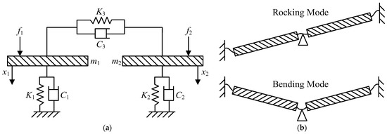 Mechanical model and vibration modes of the Ormia ochracea auditory system. (a) Two-degree-of-freedom mechanical model of the auditory system; (b) primary vibration modes of the auditory system.