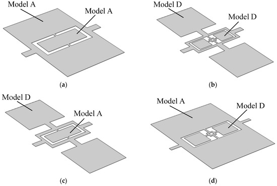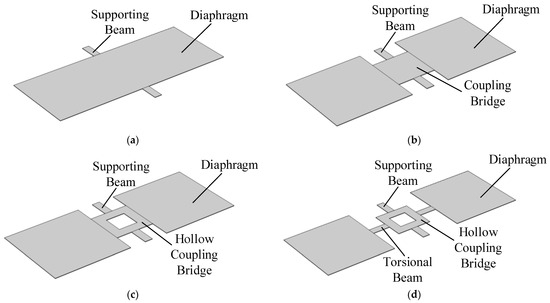 To broaden the operational frequency range of the sensor, a coupled diaphragm configuration can be implemented by integrating two sets of diaphragms. By combining Model A and Model D, four different coupled structures can be designed as follows: