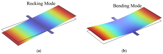 First, the eigenfrequency analysis of Model A was performed using the finite element simulation software—COMSOL Multiphysics 6.1. The simulation results indicate that Model A exhibits the same vibration modes as the auditory system of Ormia ochracea, with its mode shapes shown in Figure 3. The calculated eigenfrequencies for the rocking and bending modes of Model A are 840.2 Hz and 1902.7 Hz, respectively.