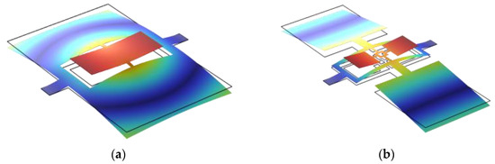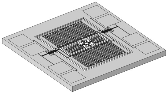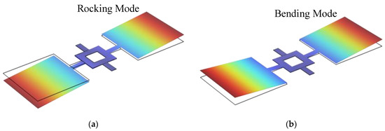 Building upon Model A, the diaphragm was split into two separate sections and connected via a coupling bridge, forming Model B, as shown in Figure 2b. The dimensions of the coupling bridge were set to 1 mm × 1 mm, the two side flaps to 2 mm × 2 mm, and the supporting beams to 0.5 mm × 0.2 mm. Simulation results indicate that the eigenfrequencies of the rocking and bending modes in Model B were reduced to 832.1 Hz and 1600.9 Hz, respectively.