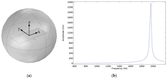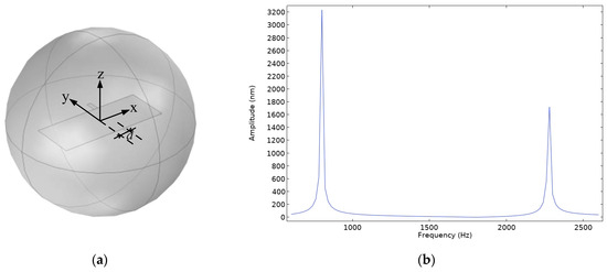 First, a simulation is conducted for Model A with symmetric wing structures, where the supporting beams are placed at the center of the diaphragm. Using COMSOL Multiphysics software, the diaphragm is positioned inside a damped spherical shell, and an incident sound source is applied outside the shell. Since the diaphragm’s size is much smaller than the distance between the sound source and the diaphragm in actual tests, the far-field condition is met. Therefore, the sound source in the simulation is set as a plane wave with a sound pressure amplitude of 1 Pa. The acoustic–structural coupling is modeled using a multi-physics approach that combines pressure acoustics and solid mechanics, with accurate physical field conditions, boundaries, and sound–structure interfaces defined. A frequency domain study is then established to calculate the amplitude variations of the diaphragm in the frequency range of 600–2200 Hz, and a frequency response curve is plotted. The simulation model and frequency response curve are shown in Figure 5.