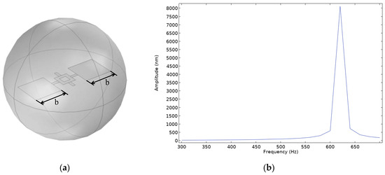 From Figure 5, it can be observed that the displacement of the diaphragm in the rocking mode is significantly smaller than that in the bending mode. For Model A, increasing the area of one side’s wing and offsetting the supporting beam have an equivalent effect in amplifying the pressure difference. However, offsetting the supporting beam is more convenient. Therefore, the supporting beam of Model A is shifted in the positive x-axis direction, with an offset a of 0.5 mm, and a frequency domain study is conducted under the same simulation conditions to calculate the amplitude variations of the diaphragm in the frequency range of 600–2600 Hz, and a frequency response curve is plotted. The simulation model and frequency response curve are shown in Figure 6.
