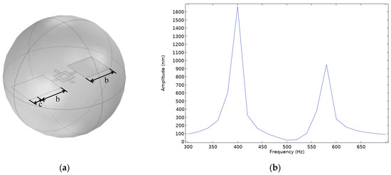 Next, a simulation is conducted for Model D with symmetric wing structures, where the areas of the wings on both sides of the diaphragm are equal, and the side lengths b of both wings are 2 mm. Using the same simulation conditions, a frequency domain study is performed to calculate the amplitude variations of the diaphragm in the frequency range of 300–700 Hz, and the frequency response curve is plotted. The simulation model and frequency response curve are shown in Figure 7.