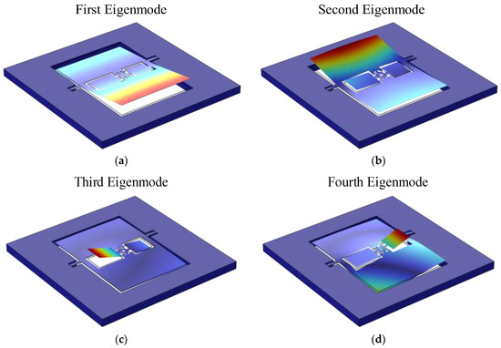 To evaluate the performance of the sensor, simulations were conducted using COMSOL Multiphysics to analyze its eigenfrequencies. The four eigenmodes are illustrated in Figure 13.